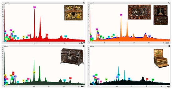 The earliest object (Casket, LS2361), decorated with matte barniz, is characterized by a limited color palette dominated by cream-colored areas that showed the ubiquitous presence of mercury (Hg), accompanied by less intense peaks of chlorine (Cl) (Figure 11A) in its pink, lilac, gray, green, and blue-green areas. The simultaneous presence of these two elements indicates the use of the pigment calomel, whose use in works of art, including in other 17th-century barniz de Pasto objects, has been widely documented in the past few years [17,18,19,20,22,33]. Calomel is extensively used to draw fine lines and cream-colored designs, and is mixed with colored resins as a matting and lightening component. In the second Coffer (LS2067) belonging to the first group, decorated with barniz brillante, the use of calomel is limited to matte cream-colored areas (mostly fine outlines), as the detection of Hg and traces of Cl suggests (Figure 11B). As commonly found in barniz brillante objects, the detection of silver all over the object aligns with the presence of a silver leaf underneath the resin sheets.