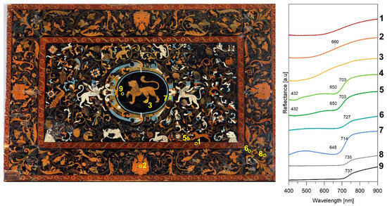 FORS analysis of a light-blue, arabesque-like illustration exhibits an absorbance maximum at 648 nm and an accompanying inflection point at 714 nm, which is consistent with the presence of indigo (Figure 12, spot 7). Indigo is also present in the nearly black medallion surrounding the central lion (Figure 12, spot 9), which is associated with an inflection point significantly red-shifted to 737 nm, although the characteristic apparent absorbance maximum is no longer evident. The reflectance properties of indigo include an absorbance maximum at approximately 660 nm and an inflection point between 690 and 730 nm [35]. This is significantly modulated by the binder, chemical environment, addition of other colorants, and concentration of indigo [36,37]. As suggested by Humboldt’s accounts, indigo was used in both blue- and black-colored resins with the intensity of the color being modulated by the dilution of the pigment. Indigo was previously identified in both black and blue mopa mopa-based resins used to decorate a 17th-century gourd [22], a 17th-century wooden chest [19], and Peruvian painted qero cups dated to the Inka colonial period [31,38]. FORS, FTIR, and imaging analyses of four Peruvian textiles dated to earlier periods reveal the use of indigo in blue and black pigments [39].