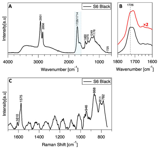 The FTIR analysis of sample S6 (Figure 13A), a visually black resin collected from the Tabletop (LS2447), shows only minor differences in the spectral signatures compared to the resin binder. In the carbonyl stretching region, the peak at 1726 cm−1 is more pronounced (Figure 13B), which may indicate the presence of an oil. Indeed, oils have also been identified in both colored and uncolored mopa mopa resins [7]. Other authors have suggested that oil slurries may have been used to facilitate the incorporation of colorants into the resin [40]. Additional weak features at 1627, 1614, and a shoulder at approximately 1480 cm−1 may be related to the use of indigo, which has been identified previously in blue- and black-colored resins in Colombian lacquerwares [7,22]. Raman analysis of the same sample confirms the identification of an indigotin-based colorant based on the presence of a characteristic Raman shift at 1576 cm−1 (Figure 13C) [22,36,41].