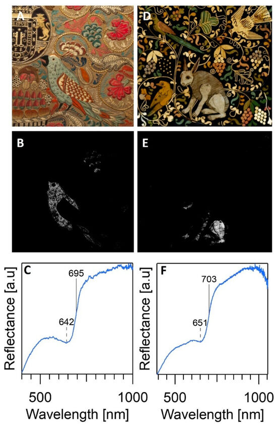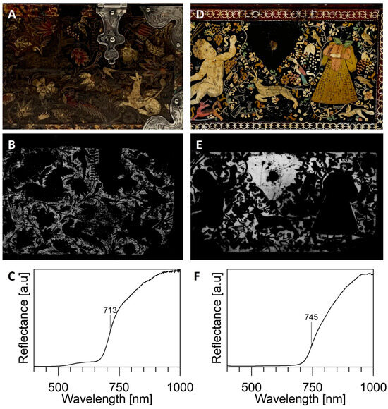 Area of (A) Coffer (LS2067) and (D) the front face of the Casket (LS2361) analyzed by RIS and endmember rule images (distribution maps) for (B) LS2067 and (E) LS2361 showing the distribution of a near-black, indigo-containing compound. Reflectance spectra corresponding to the endmembers for (C) LS2067 and (F) LS2361 with relevant reflectance properties indicated.