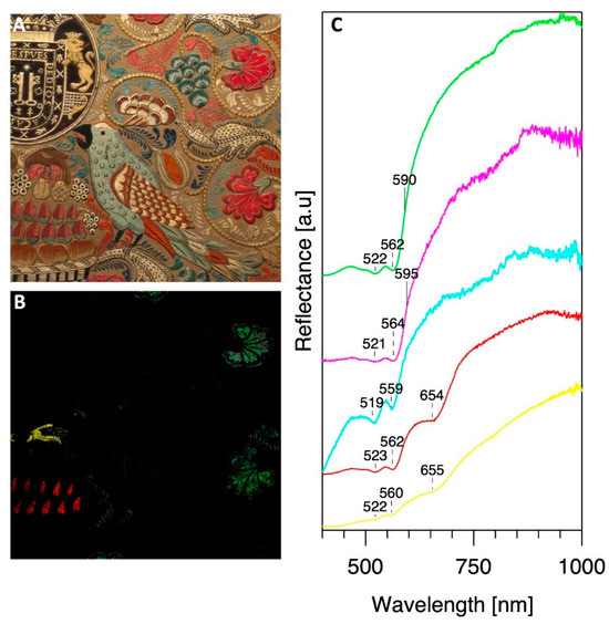 - Maynez-Rojas, M.A.; Casanova-González, E.; Ruvalcaba-Sil, J.L. Identification of natural red and purple dyes on textiles by fiber-optics reflectance spectroscopy. Spectrochim. Acta Part A Mol. Biomol. Spectrosc. 2017, 178, 239–250. [Google Scholar] [CrossRef] [PubMed]