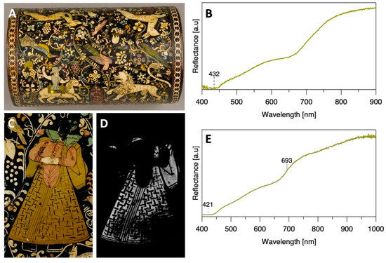 As discussed by other authors, in areas of concentrated indigo, the absorbance maximum typically observed at ca. 660 nm is absent [42]. Similar conclusions are reported by Alvarez-White and coauthors [5], who note that dark backgrounds on a selection of barniz de Pasto objects are possibly associated with densely saturated or calcined indigo. The pXRF analysis of the black background surrounding the lock on the front of the Casket detected only very weak signals of Cl and Hg, suggesting that no inorganic colorants are present in this area. However, their presence, even though in traces, might be either due to contamination or to a deeper layer possibly containing calomel.