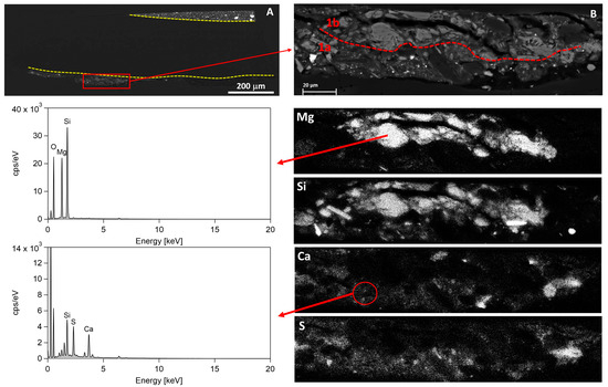(A) BSE image of cross section of S1 from the Tabletop (LS2447). The red rectangle indicates the ground layer; (B) zoomed BSE image of the ground layer, with two separate layers of different compositions and grain size clearly visible. The elemental distributions of magnesium, silicon, calcium, and sulfur are reported below, as well as EDS analyses of a magnesium silicate particle, likely talc, and of a calcium–silicon-rich area, possibly due to a mixture of calcium sulfate (likely gypsum) and a very-fine-grained clay.
