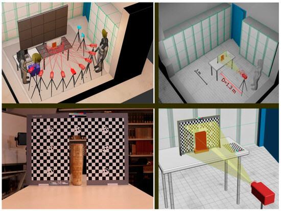 The diversity of technical characteristics of the photogrammetric and thermographic acquisition tools in terms of optics, focal length, depth of field, distance to be observed from the artefact, and the need on the part of the staff engaged in digitisation to move around the manuscript made it necessary not only to calibrate all the cameras, but also to design and organise the work space and the acquisition set extremely carefully. Therefore, 3D simulations of the acquisition space and set were created prior to carrying out the work in the library (Figure 2).