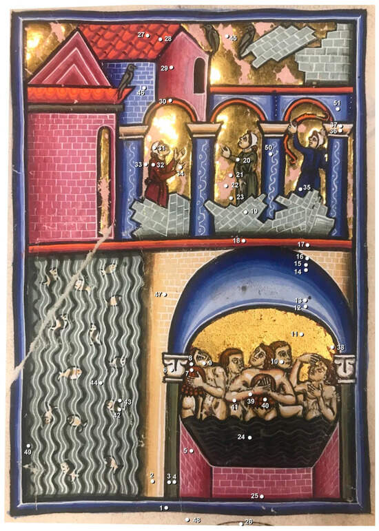 It would be essential to study other illustrated manuscripts traditionally attributed to the same cultural area in order to reconstruct assonances and dissonances in the choice of materials and execution techniques. This could add new elements to the complex debate on the production environments of illuminated manuscripts, the artists involved in their decoration, and the other actors involved in their production. Scholars wonder where, by whom, and at whose behest the masterpieces of 13th-century southern Italian illumination, culturally related to our Codex, were executed [21]. Locating the areas of production, delineating the personalities of the artists, and identifying possible patrons are the great challenges of research.