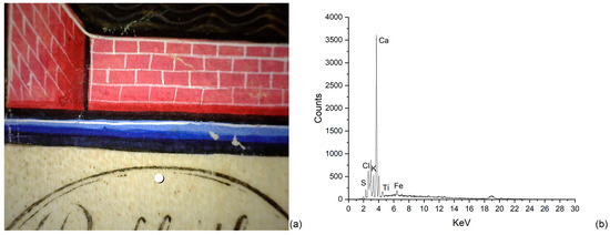 Moreover, the thermographic results obtained on c. 10r enabled the detection of different features of interest from the artistic point of view and, mainly, were used to direct punctual investigations. Among them, one of the main important results consisted in the possibility to observe a different thermal behaviour of the gildings in the single illumination of Figure 5. In fact, the gilding in the upper part of the illumination (Figure 5a), characterised by a mirror-like appearance, presents several detachments, indicated by the arrows, while the less glossy gilding in the lower part shows a very good conservation state (Figure 5b). This difference could be due to the use of different materials, both for the gilding and the preparatory layer, or gilding techniques. As will be shown hereafter, the Raman spectroscopy and XRF results, which are reported in the following Section 3.3.7, confirmed the different composition of the preparatory layer beneath the two gilding parts, eventually responsible for the different kind of damage observed.
