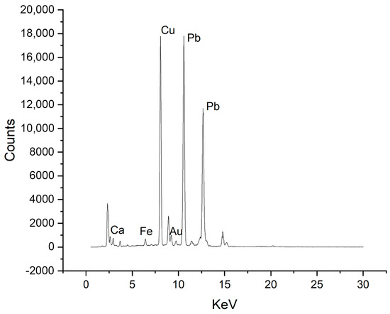 A portable XRF analyser Elio (Bruker, Billerica, MA, USA) was used for XRF analysis; the instrument is equipped with an excitation Rh target X-ray tube, 10 kV–50 kV, 5 µA–200 μA, 4 W, a SDD detector (area 17 mm2) with CUBE technology, energy resolution < 140 eV for Mn Kα, and collimator of 1 mm. The detected elements range from Na (Z = 11) (with helium purge) to U (Z = 92). The instrument is equipped with two pointing lasers (axial and focal) for the alignment and with an internal digital camera to acquire a magnified image of the analysed area, with a field of view of 10 mm × 10 mm. The analyser is fixed on a motorised XY stage, in turn mounted on a tripod (height 43–188 cm) for 2D mapping with a travel range of 100 mm × 100 mm. The dimensions of the measurement head are 170 mm × 265 mm × 170 mm (W × D × H), the weight 2.1 kg. The data acquisition is controlled by software ELIO package, the post-processing mapping analysis is performed by ESPRIT Reveal software.