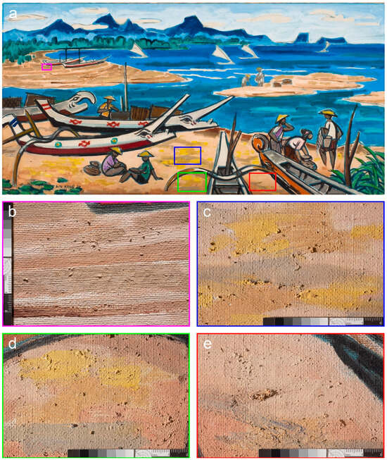 (a) Liu Kang, Boat scene, 1974, oil on canvas, 71.5 × 142.5 cm, showing four selected areas of the paint layer (pink, blue, green and red rectangles) and corresponding close-ups of the painting, revealing protrusions (b–e). The artwork was generously donated by the artist’s family. Collection of the National Gallery Singapore. Image courtesy of the National Heritage Board, Singapore.