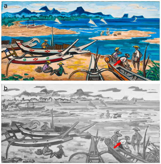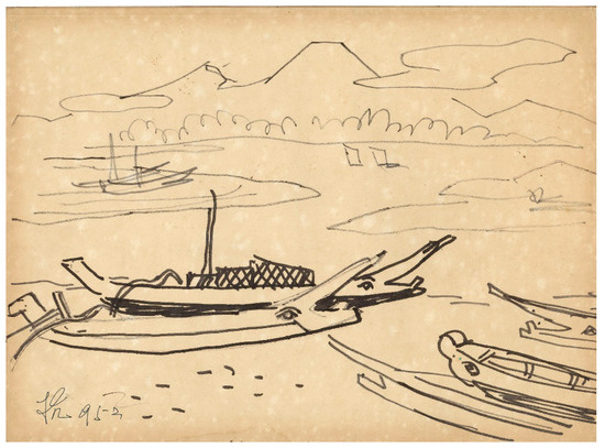 Liu Kang was born in China. He received formal artistic training in Shanghai (1926–1928) and, later, in Paris (1929–1932). In 1945, he made Singapore his permanent home and emerged as a prominent figure within the country’s art scene, notably contributing to the development of the Nanyang style. The style was invented and popularised in Singapore from the late 1940s to 1960s; it combined influences from the School of Paris and Chinese painting traditions, while also integrating stylistic elements characteristic of batik techniques [1,2,3]. Although the painting Boat scene was created in 1974, it follows a sketch made in Bali in 1952 (Figure 2) and embodies the fundamental tenets of the Nanyang style in its use of local subject matter and an exposed white ground to enhance the elements of the composition.
