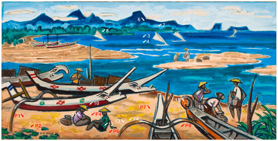 The study investigates the ground and paint layers of the painting Boat scene, by Liu Kang, which measures 71.5 × 142.5 cm. In total, 19 samples of the paint material were collected, comprising eight samples of the protrusions from the yellow paint layer. The protrusion samples are distinguished from other paint samples by the prefix “P”, followed by a number in ascending order. Additionally, samples of the paint layer, representing the major pigment mixtures, are labelled with numbers arranged in ascending order. The specific sampling areas are highlighted in Figure 3. The structure of the painting support was not within the scope of the investigation strategy.