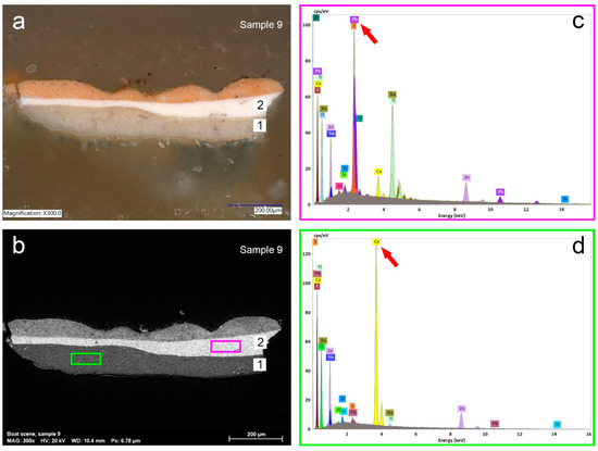 Optical microscopy (a) and corresponding BSE image (b) of the cross-section of sample 9 at 300× magnification, with marked bottom (1) and top (2) layers of the ground. The coloured rectangular outlines in the BSE image (b) show the SEM-EDS areas of analyses. The corresponding spectra show strong Pb (c) and Ca (d) signals (indicated by red arrows), respectively, from the top and bottom layers of the ground.