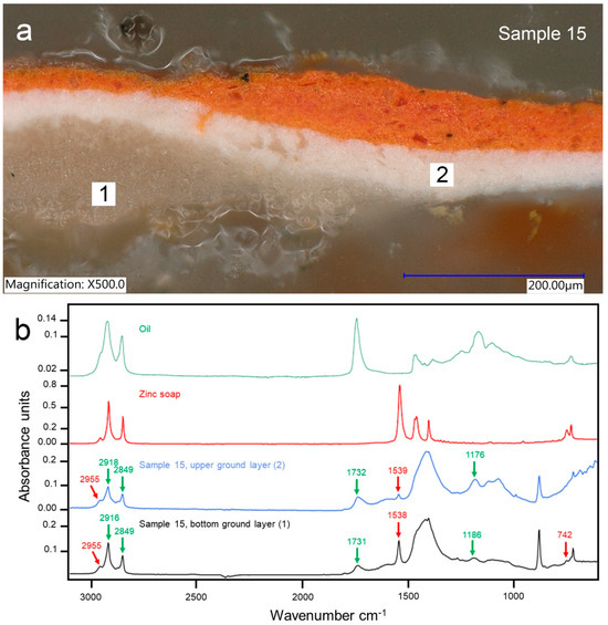 Microscopy image of cross-section of sample 15 from the orange paint viewed in VIS (a). ATR μ-FTIR spectra derived from the bottom (1) and upper layers (2) of the ground preparation with labelled marker peaks of zinc soap and oil along with reference samples of identical materials (b).
