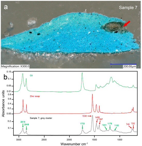 Microscopy image of cross-section of sample 7 from the blue paint viewed in VIS (a). The red arrow indicates the ATR μ-FTIR measurement spot in the cluster of partially mixed white paint. ATR μ-FTIR spectra derived from the grey cluster with labelled marker peaks of zinc soap and oil along with reference samples of identical materials (b).