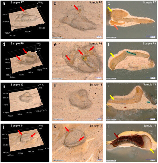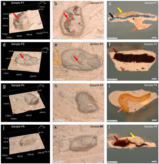 OM of eight cross-sections of the protrusions revealed a heterogenous build-up due to the presence of large clusters of different colours (Figure 8c,f,i,l and Figure 9c,f,i,l). Clusters of four colours were recorded: dark brown (Figure 8f,l and Figure 9l), orange (Figure 8c,i and Figure 9c), grey-yellow (Figure 8c,l and Figure 9c,f,i,l) and black (Figure 8c). Sometimes, clusters of two or three colours coexist in one sample. The clusters of colours have defined edge lines, leading us to conclude that they were dry when mixed with the yellow paint used for depicting the beach.