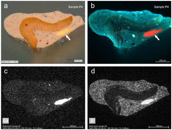 Microscopy images of cross-section of sample P4 at 300× magnification photographed in VIS (a) and UV (b) and corresponding SEM-EDS elemental distribution maps of Cd (c) and S (d). The intensity of the signal of each element is depicted by a range of grey tones, where white represents high intensity and black represents low intensity. The red fluorescence of yellow paint indicated by white arrows (a,b) and concomitant strong Cd and S signals suggest the presence of cadmium yellow.