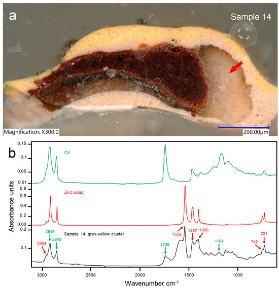 Microscopy image of cross-section of sample 14 from the yellow paint protrusion viewed in VIS (a). The red arrow indicates the ATR μ-FTIR measurement spot in the area of the grey-yellow cluster. ATR μ-FTIR spectra derived from the grey-yellow cluster with labelled marker peaks of zinc soap and oil along with reference samples of identical materials (b).