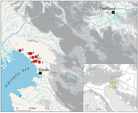 The number of natural caves is high, about 3000, and this feature certainly conditioned the use of the area during Prehistory, but it was also the target of field investigations that began in the last decades of the 19th century. Indeed, both professionals and speleologists/amateurs were attracted by these caves, with two main consequences: archaeological remains have been found in c. 180 caves, while only a few open-air sites are known until the beginning of the Bronze Age [4,5] when massive stone structures—called castellieri—were built on top of many hills in Karst and Istria; the quality of the recovered data is non-homogenous, as it reflects the different preparation of the researchers.