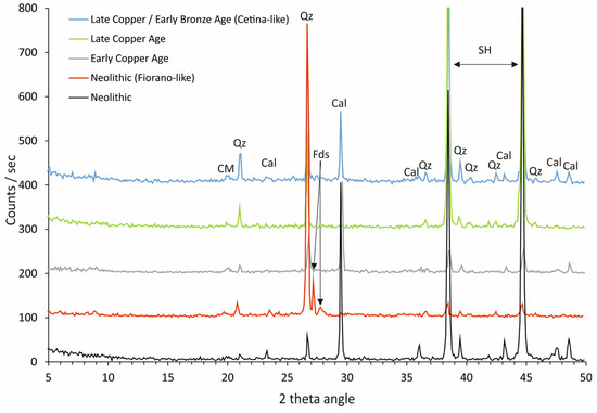 Regarding the LCA ceramics, the current data suggest a probable local production primarily for a limited subset of potsherds. Specifically, this subset comprises those containing sparry calcite, which, according to the PCA diagram of XRD spectra, align within the same category as Neolithic materials (Cluster 1 of Figure 9 and Figure 10).