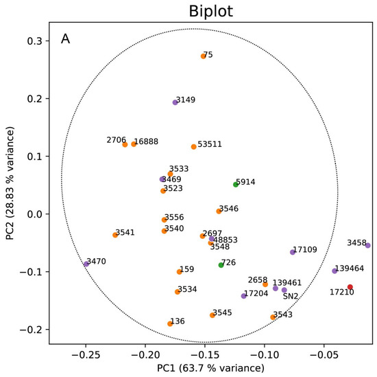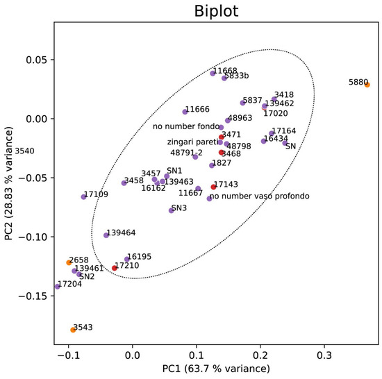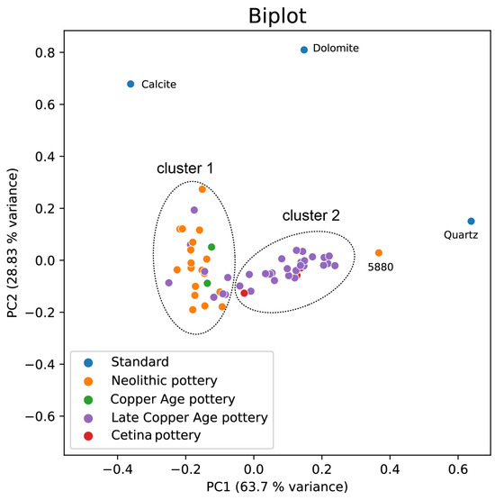 In the present study, we have directly applied PCA on X-ray spectra in order to achieve a qualitative evaluation of the mineralogical composition of the investigated vessels. PCA of XRD spectra was calculated with Python via the Scikit-learn library [62]. Prior to computing statistical analyses on X-ray intensity spectra, data were log10-transformed and filtered, isolating only 2θ values associated with main peak areas; then, the intensity values of each sample were normalized for their maximum intensity values. XRD profiles of pure calcite, quartz, and dolomite, the main components of the lithologies present in the area [1,2,3], have been downloaded from the RRUFF Project website (https://rruff.info/, accessed on 12 October 2023) and analyzed following the same procedure. Tests were successfully performed to determine if data were suited for factory analysis: Barlett’s sphericity test results successfully with p < 0.001 and KMO = 0.70 (Kaiser-Meyer-Olkin test; acceptable values for KMO > 0.5).