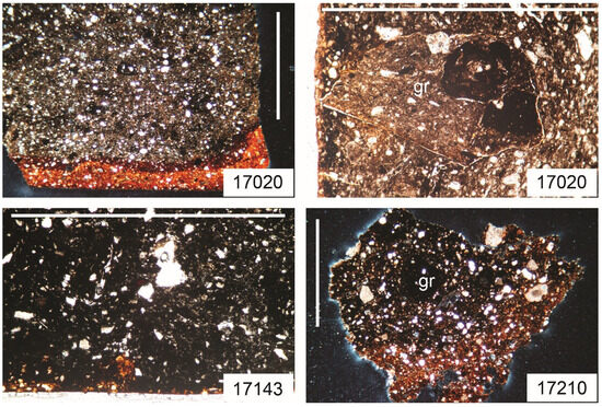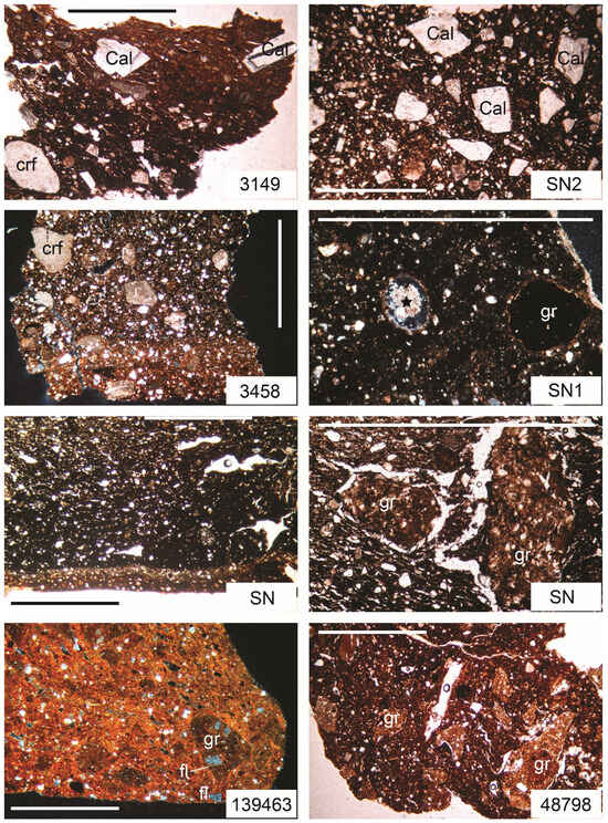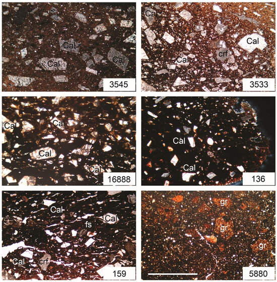 Most of the Neolithic vessels, including vasi a coppa, carinated bowls, bowls, and a decorated beaker, show very similar features (Figure 2, Figure 3 and Figure 4; 12). They are characterized by very abundant sparry calcite (up to 40%) and less common carbonate rock fragments as temper material and a fine-grained matrix, containing angular quartz grains with silt- to very fine-sand-size and, occasionally, clay pellets (Figure 12). The globular vessel analyzed (Figure 3, no numb. 159), whose typology is not typical of the Vlaška Culture, is similar to the previous ones, but it additionally contains a grog fragment and a fossil, probably an echinoid fragment.