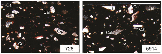 Thin-section photomicrographs of the analyzed Early Copper Age vessels. Cal: Calcite; crossed-polarised light; scale bar: 2 mm.