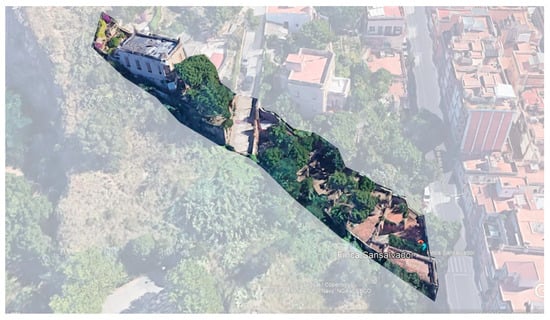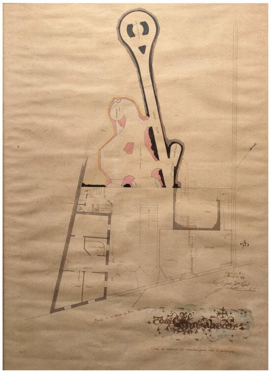 The Sansalvador villa was built in Barcelona’s El Coll district, in the neighborhood of Gracia, between 1909 and 1924, located in a mountainous area behind the Park Güell [6]. It is a narrow and long plot with a pronounced slope, facing southeast and divided by Pineda Street (Figure 1). The lower part faces Passeig de la Mare de Déu del Coll, where the guard’s pavilion and the perimeter fence of the entire site were first built. The domestic house, which was never built, was planned in the upper part of the site, facing Pineda Street. In 1915, a well was dug in order to find a potable water supply. Instead, water with traces of radium (which had been discovered by Marie Curie in 1898) was discovered. Convinced that radium had healing properties, the Sansalvador family created the company Aigua Radial SL, in order to commercialize bottled radium water [7]. Therefore, they changed the initial commission of a second family summer residence to a commission of a healing water company with the appearance of a bathing establishment. Thus, they invested the project’s budget to make grottoes that allowed the extraction of water and external visits. Some years after, in 1917, they commissioned Jujol to build a house to rent, as an investment, in the separate plot, which they called the Queralt house [8]. In 1921, the Sansalvador family asked the architect to remodel the guard’s pavilion in order to transform it into their own home. Finally, in 1924, access to the upper part of the plot, where the initial house was planned but never built, was consolidated. Over the years, the water ran out of the grotto, the company was dissolved, and with the death of the owner in 1932, the property passed into the hands of his sisters [7]. Eventually, the property was sold to the quarry next to it. In 1987, it was acquired by the city council. During all these decades, the Queralt house was rented, while the Sansalvador villa was abandoned, repeatedly occupied, and vandalized to a state of ruin. In response to residents’ complaints, the city council commissioned Calbet–Elías–Gruartmoner Architects to rehabilitate the villa, which they did between 2005 and 2015. It currently houses the Taller d’Història de Gràcia office.