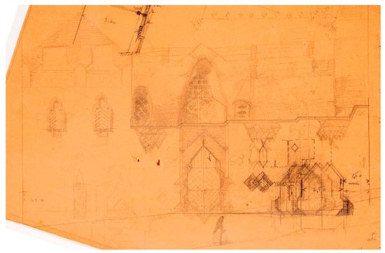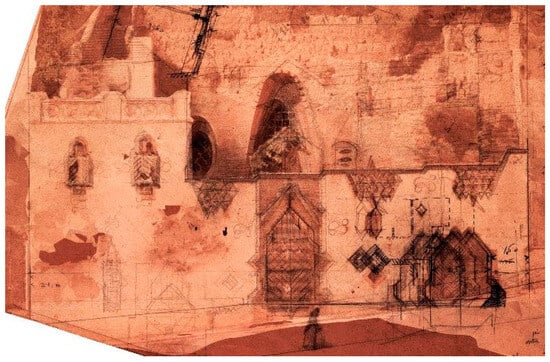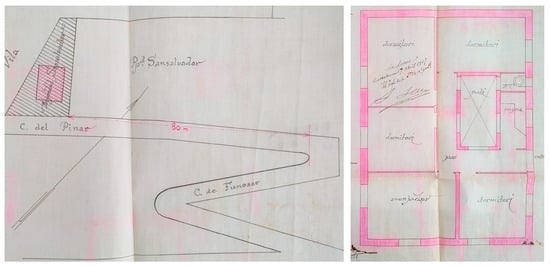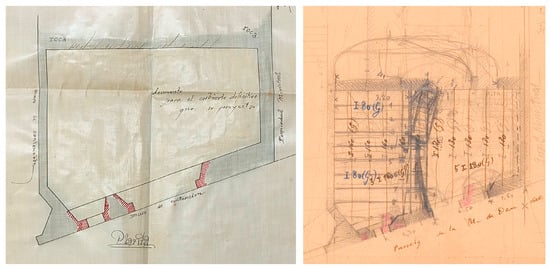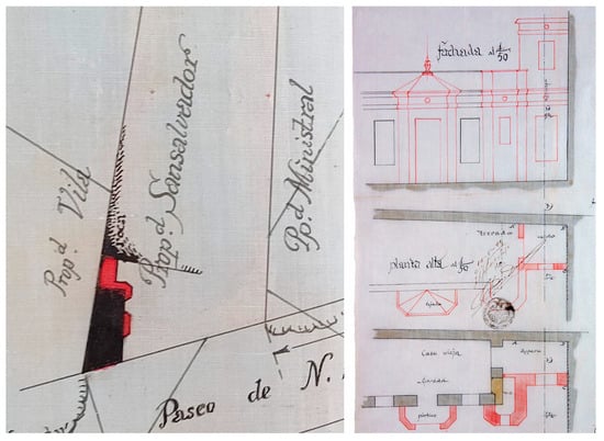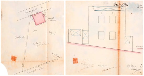 Examining the west elevation (Figure 4-left), a notable “difference of 3′40″ is observed, denoting the vertical disparity between the street level and the plot. The basement area is delineated with horizontal lines, indicative of exposed brickwork, while the upper part is depicted in white, embellished with quadrilobed crosses and pointed lintel windows, and executed in a Mudejar style (rendered freehand) [14]. Additionally, the depiction of the land beneath the house is represented as a sloping line, annotated with the term “orchard”.