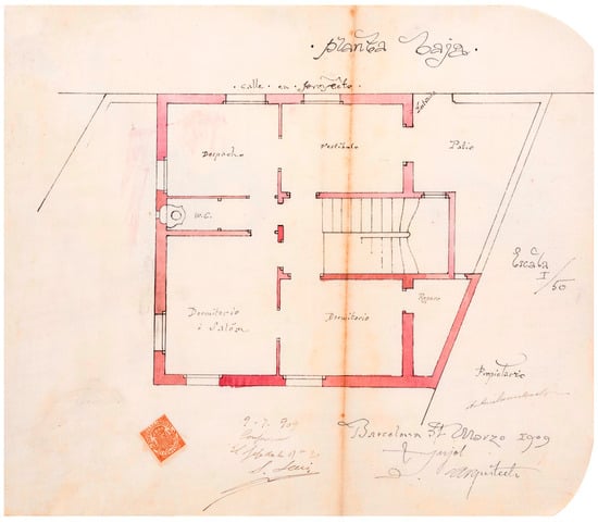 According to this same documentation, Jujol’s intention was to carry out a simple project distributed across three levels and to allocate the rest of the plot to a garden (Figure 3). The basement floor would contain the kitchen, dining room, and main access from the garden. The first floor, at the same level as Pineda Street, would have bedrooms and an office. The second floor would contain bedrooms and the staircase to the rooftop, while the roof would only have the indication of the outward staircase.
