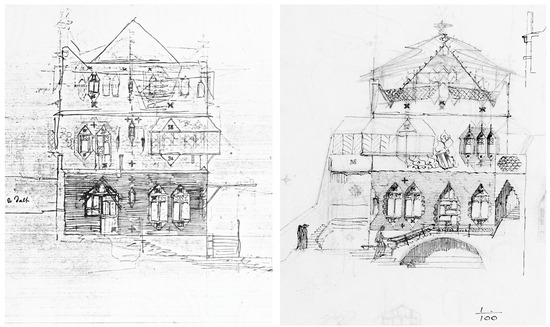 Conversely, the south elevation (Figure 4-right) affords a clearer view of a cantilevered veranda on the first floor, adorned with heraldic and religious motifs such as a sloping shield, crosses, and arabesques. We can also appreciate in more detail the pointed lintel windows that pronounce their verticality, the existence of a hipped roof with various additions (such as a five-pointed cross and a parapet formed by twelve stone points), and the placement of skylights and stairs. On the right side, there are also external stairs that ascend directly to the upper entrance.