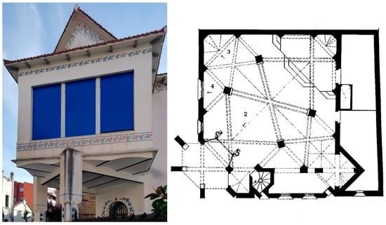 In 1917, the Queralt family commissioned the architect to design their house (Figure 12) on a portion of the plot that had been segregated by the upper road [8]. This building had a modest budget and consisted of a two-story parallelepiped with one dwelling on each floor. Its most characteristic element is the opening of the south corner, where it features a glazed tribune rotated 45º and a balcony on the top floor. It has relatively complex brick bonding, forging, and details between the different angles. On its rear façade, there is also a staircase that provides access to the roof and serves as a porch for the second-floor entrance.