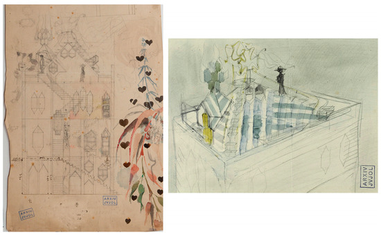The roof shown in the aerial perspective (Figure 6-right) corresponds to the roof drawn in the west elevation. Therefore, these two drawings are probably contemporary, from 1915. The axonometric viewpoint accentuates the significance of the west facade, prominently featured in the foreground. The outstanding volume that seems like a skylight is indeed the last run of the staircase poised over the roof. Therefore, we can determine the position of the stairs.