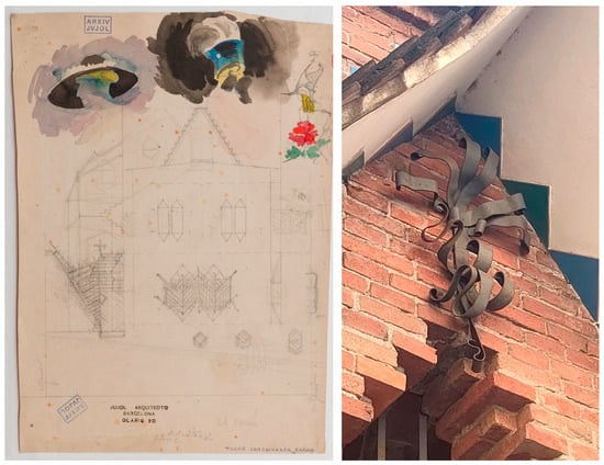 In his studio drawings, Jujol used to juxtapose other drawings in the paper margins, usually freehand and in watercolor. These drawings, which may seem haphazard, contain Jujol’s hidden ideas. If we pay attention to the figure of the red flower (probably a carnation) and we turn it upside down, we can appreciate that it is in fact the design of the floral pattern of the main gate (Figure 7-right). From the flower, a white grape form is suspended, with two crosses and a conical form similar to a morning-glory flower. Jujol’s interest in natural forms such as animals and flowers is always present, evident even in early works [16]. Therefore, despite the erratic disposal of marginal drawings, each one of them is likely an external idea or reflection that holds in the architect’s mind and sometimes crystallizes in architectural form [17].