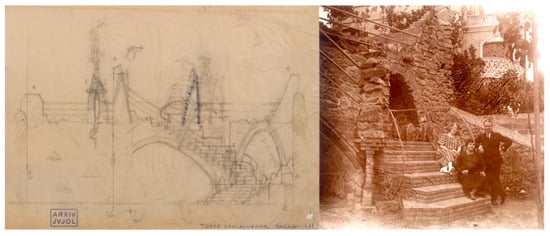 One of the firsts projects carried out by Jujol as an independent architect was the Sansalvador villa. Both Antoni Sansalvador and Josep Maria Jujol lived in the neighborhood of Gracia in Barcelona, so they knew each other from childhood and attended the same school. Although this project is usually considered a secondary and youthful work, indeed, it contains the seeds of much of the personality of Jujol’s mature architecture. Its main feature is the consciousness of the importance of the place. Understanding the place as the genius loci, pre-existing qualities are derived from Mediterranean weather conditions as much as Catalan culture. When studying the work of Catalan artists such as Miró, Jujol, or Brossa, Perejaume identifies an underlying form and significance that, although it has never been said or taught and does not have linear connections, gathers all of them as part of the same thing [5]. This gathering is characterized by the use of ground, stones, and sand, i.e., nature itself as part of the definition of materiality and form.