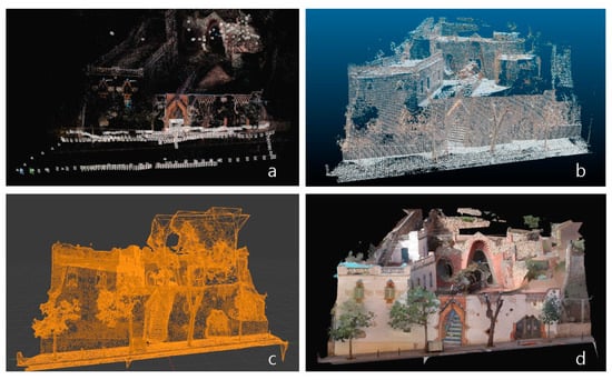 In this work, we generated the models of the Sansalvador villa using the photogrammetry technique of structure from motion (SfM) and multi-view stereo (MVS). SfM-MVS photogrammetry is a technique that uses multiple photographs to reconstruct the three-dimensional structure of an object or scene [20]. It is based on finding IP correspondence points in the images and calculating their relative position in space to generate a 3D model (Figure 15a).