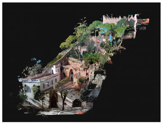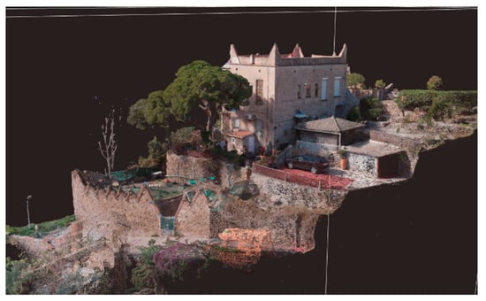 The fieldwork consists of four sessions, each lasting 8 h. It is worth mentioning that the set presents great difficulty due to the configuration of the building, its adaptation to the terrain and its steep slope, and the inclusion of abundant vegetation. The survey combines high-resolution photography (24.1 Megapixel Nikon D5200: Nikon, Barcelona, Spain) with drone aerial capture (DJI Spark 12 effective Megapixels (3969 × 2976)) and additional detailed captures of the courtyard and grottoes (18.2 Megapixel Sony DSC-H80) coupled with spot video footage taken in dark areas. After two sessions, the processing of a total of 3985 images begins using Reality Capture software 1.3, resulting in the alignment of the captured images and the creation of a model consisting of 290.9 million polygons.