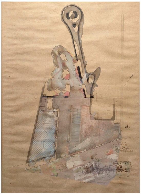 The plan entitled “works of extension of the spring-grottoes under the mountain”, allows us to confirm that by 10 March 1916, the terrace had already been built at an altitude of 4′30 m, alongside the main access staircase and the guard pavilion. Meanwhile, the construction of the grottoes was in progress. In the plan, three colors are depicted: gray, black, and red. According to the convention in the representation of architectural plans, gray indicates that it is a construction outside the scope to be treated, in this case, everything that is not the grottoes. Black represents the consolidated part (the part of the grotto already built), and red indicates the new work, i.e., the grotto projected by Jujol (Figure 11).