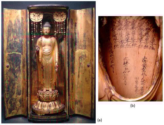 The analyzed sculpture, from a private collection, depicts Amida Nyorai (Buddha) standing on a lotus base (Figure 1a). The wooden figure, lacquered and gilded, was made using the Yosegi-Zukuri (assembled pieces) [16] technique in a workshop located in present-day Kyoto prefecture. The head is painted with a bluish pigment, as is common in Japanese practice for such Buddhist representations. We were fortunate to be allowed to analyze it, as it bears an inscription with the date of the 7th year of the Genroku period, corresponding to the year 1694 (Figure 1b).