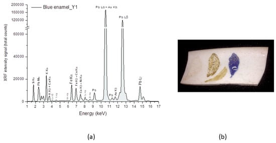 (a) XRF spectrum of the blue enamel analyzed on shard Y1; (b) Shard Y1.