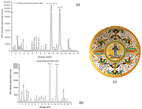 (a) XRF spectrum of the blue color analyzed on the Italian overglaze-enameled majolica fired at Deruta kilns, 1600–1650 (private collection); (b) XRF spectrum of the glaze; (c) Italian majolica dish fired at Deruta.