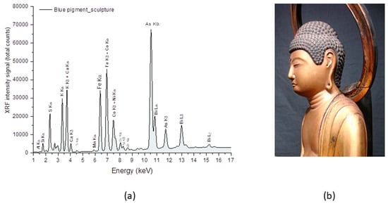(a) XRF spectrum of the blue enamel analyzed on the head of the Buddhist sculpture; (b) close-up of the sculpture.