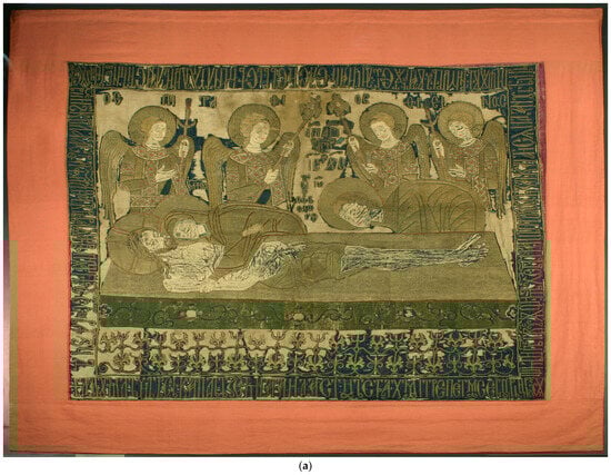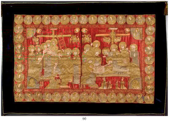 Liturgical textiles of Byzantine tradition have two different supports, with distinct roles: one to provide resistance and another one as a base for building the relief [8]. The former is composed of a cellulosic support (never visible) (Figure 1), which is not coloured, and a silk support with an aesthetic role, which is totally or partially visible [8]. In order to provide a contrast with the precious metallic embroidery, as well as to give it importance, the silk support was coloured according to the Church canons: purple-red in most cases, with blue, yellow and brown also accepted [8]. Embroidery is made with silk threads—visible or wrapped up in precious metallic bands and wires––or just with metallic threads, to result in the so-called “needle painting” [9]. The scenes and decoration cover most of the silk support, which in some cases becomes almost completely masked [8] (Figure 1).