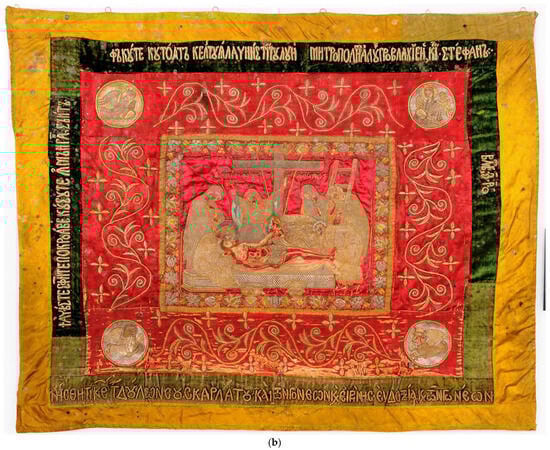 - Putna, M. Treasury of Putna Monastery. Embroideries and Fabrics 2017; Centrul de Cercetare si Documentare—Stefan cel Mare, Ed.; Iacov Putneanul: Suceava, Romania, 2017. [Google Scholar]