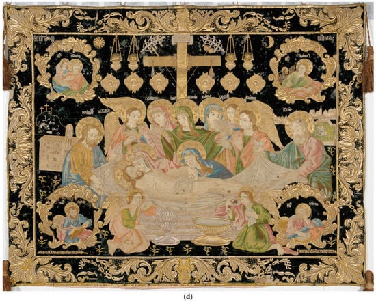 Twenty-four liturgical textiles were studied, all defined as epitaphios or aër. According to the technique, most of the objects (21/24) are embroideries in the Byzantine tradition, while two have the scene painted on a silk support (Figure 4), and in one other, it is rep-resented in the Gobelin needlepoint technique. The textiles are dated between the 14th and the 19th century and are documented as Byzantine, Moldavian, Wallachian, Greek, Russian, of Viennese origin or from Constantinople (present-day Istanbul) (see Table 1). Fifty-seven samples were available for analysis. According to the sampling strategy, the specimens’ withdrawal was limited to the degraded areas, as the objects reverse sides were not accessible because they were covered by linings. As a consequence, most of the samples (32/57) are from the textiles’ supports, with samples being taken either from the main scene or from the frame, for all but four objects. For the other objects, samples are from embroidery threads (17/57) or from the original linings (8/57). One sample (1/57) comes from an ornamental silk cord frame. The present approach, which aims to document materials in the MNAR collection of liturgical textiles is very different compared with the previous ones performed in the same research group [2,3,4,5], where studies were correlated with restoration and more sampling areas were accessible.