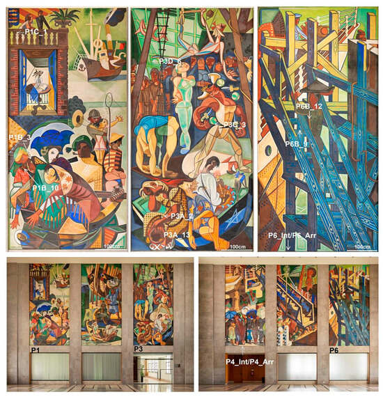 Almada Negreiros was one of the leading figures in Portuguese art and culture in the first half of the 20th century. With a career spanning almost 60 years, he belongs to the first generation of modernism in Portugal and is the author of a vast artistic oeuvre in distinct types of materials []. Between 1938 and 1956, he painted five sets of mural paintings in the city of Lisbon that are today considered masterpieces of modern art and which have been studied since 2021 from a technical, material, and diagnostic point of view as part of a transdisciplinary project ALMADA_Unveiling the mural painting art of Almada Negreiros [,,,,]. Among the works under study, the mural paintings painted in 1949 at the maritime station of Rocha do Conde de Óbidos stand out not only for their artistic and historical importance but also for the caused controversy before and after they were realised []. This set of paintings, made up of six monumental murals, is the most paradigmatic and challenging case study of the project (Figure 1). Paradigmatic because it is Almada’s greatest artistic achievement as a muralist painter, but also paradigmatic in terms of the materials and techniques used by the artist. These paintings, like the other sets, are written down only as frescoes in the official commission documents, but it is unlikely that they were entirely created using this technique due to their characteristics, which raises a number of unanswered questions for technical art history and conservation–restoration.