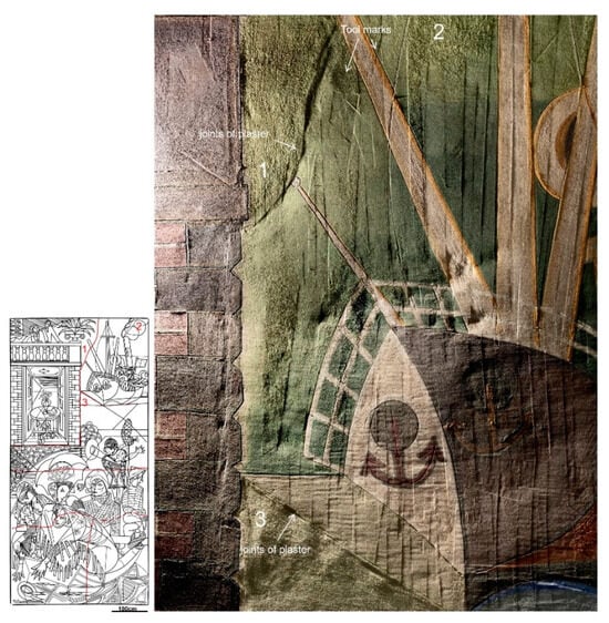 In the paintings from the maritime station of Rocha do Conde de Óbidos, the distinction between the two methodologies is not always straightforward due to the position, shape, and dimensions of the mortar sections (Figure 2). In the detailed analysis of the three murals, only in P6 is it clear that Almada proceeded by pontate, with each painted section corresponding to a story of the scaffolding. In P3, he seems to have used both types, although only horizontal joins are seen, and in P1, most of the mortar sections are unusually large for giornate. In this painting, some sections have more than 2 m × 1.5 m and have certainly surpassed a story of scaffolding (for example, the patch n°1, Figure 2).