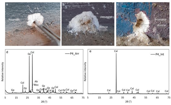 Above, details of the sampling location of samples P3A_13 (a), P4_Int and P4_Arr (b), and P6_Int and P6_Arr (c) collected from lacunae of approximately 1.5 to 3 cm long at the edges of P3, P4, and P6. Below, diffractograms of P4_Arr (d) and P4_Int (e), representative of the four powdered mortars samples analysed by XRD.