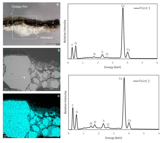On the other hand, the two samples of intonaco are essentially composed of calcite (Table 1, Figure 4e). SEM-EDS analysis of the intonaco of the P3A_13 cross-section also shows heterogeneous fragments of crushed carbonates around 400 µm to 50 µm long embedded in a Ca matrix (Figure 5). This material was used as a binder and as an aggregate, which explains the white colour observed in the lacunae. The quartz detected by XRD in sample P4_Int is associated with siliceous aggregates (sands). No gypsum was found in the two samples of intonaco analysed by XRD (Table 1).