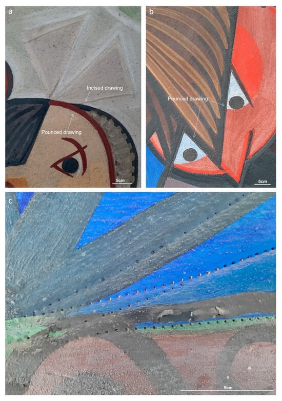 Traditionally, the poncif (or pounced drawing) technique involves making a series of small holes with a pointed instrument through the drawing executed on a piece of paper so that it can be reproduced on the wall by tapping with a gauze sachet filled with charcoal, or other powder pigments. The pigment passes through the holes made by a needle and is deposited on the surface of the intonaco []. Pounced drawing was one of the methods used by Almada, and it was usually followed by incisions made on top with the handle of the brush to link the dots together [,]. In the upper part of P1, there are still traces of such black dots. On the bottom half onwards, and on the remaining painted murals, Almada has pierced the paper with the drawings directly in the fresh mortar, leaving the holes imprinted on the surface. Figure 6a,b shows, by Vis-Rak, the two types of techniques used, and in Figure 6c, the detail in Vis of the imprinted holes, circa 3 mm apart, strongly suggesting that a round-tipped instrument was used for the purpose. By Vis-raking light, a slight rounded groove linking the holes can also be noticed, caused by the pressure exerted to pierce the drawings through the paper on the wet plaster (Figure 6c and Figure 7a,c).