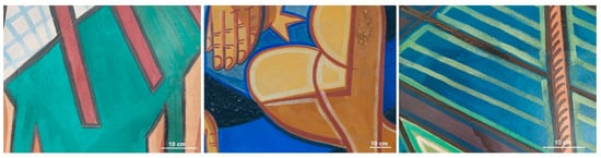 In all three murals, the amount of decoration details is quite significant and visually rich in terms of colours, patterns, and motifs. Each figure painted is different, as are all the decorative motifs (Figure 1). The paint structure does not follow a strict and rigid build-up from light to dark. Almada freely adapted according to the motif depicted and masterfully used primary and complementary colours to shade and give volume. To achieve the vivid colour palette present in all the murals, the artist did not confine himself to iron-based pigments, traditionally used in fresco mural paintings, as already reported in a previous study []. He has also resorted to the synthetic ultramarine blue and cadmium-based pigments, as well as the exotic but toxic copper (II)-acetoarsenite, commonly known as emerald green (Table 2). These pigments were used pure, mixed, and overlayed, as can be seen by OM-Vis in the paint layers of Figure 11.
