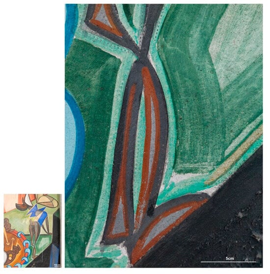Technical and material studies of mural paintings produced in the first half of the 20th century are still an unexplored field of research. The Industrial Revolution and advances in the chemical dyeing and painting industry from the 19th century onwards introduced new materials (such as Portland cement, acrylic, vinyl, and silicate-based paints) and paved new ways for mural painters to express their art on walls [,,,,]. All over the world, artists ceased to limit themselves to the traditional methods of fresco and secco and started experimenting with new painting techniques and synthetic colours [,,]. One of the most striking and well-known examples is Alvara Sequeiros’ mural America Tropical, done in 1932 in downtown Los Angeles (USA) by using a modified fresco technique on cement with a variety of modern tools [].